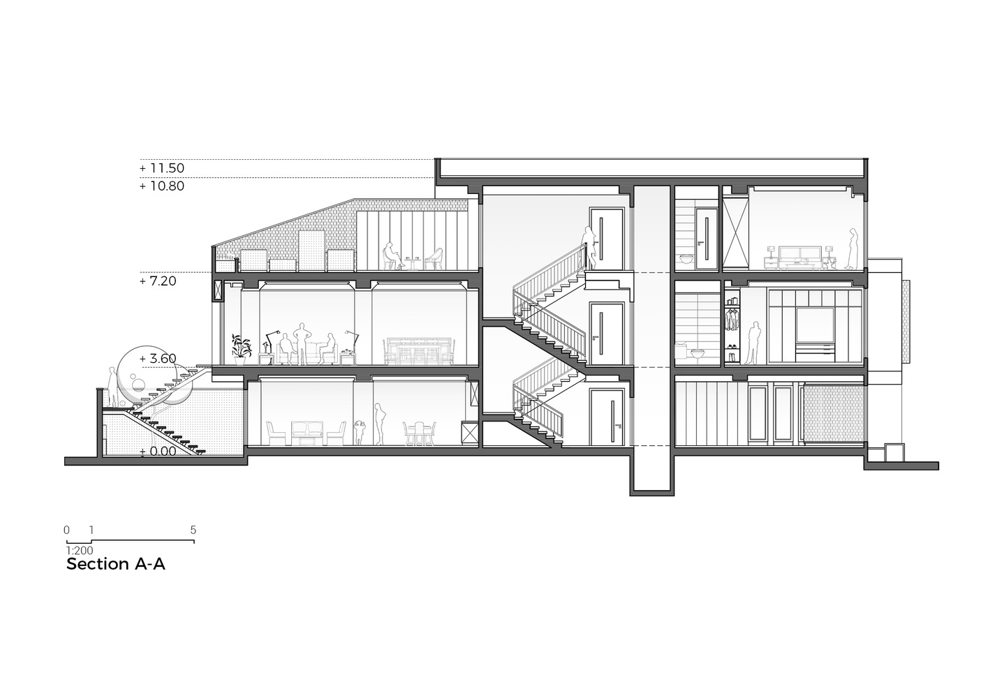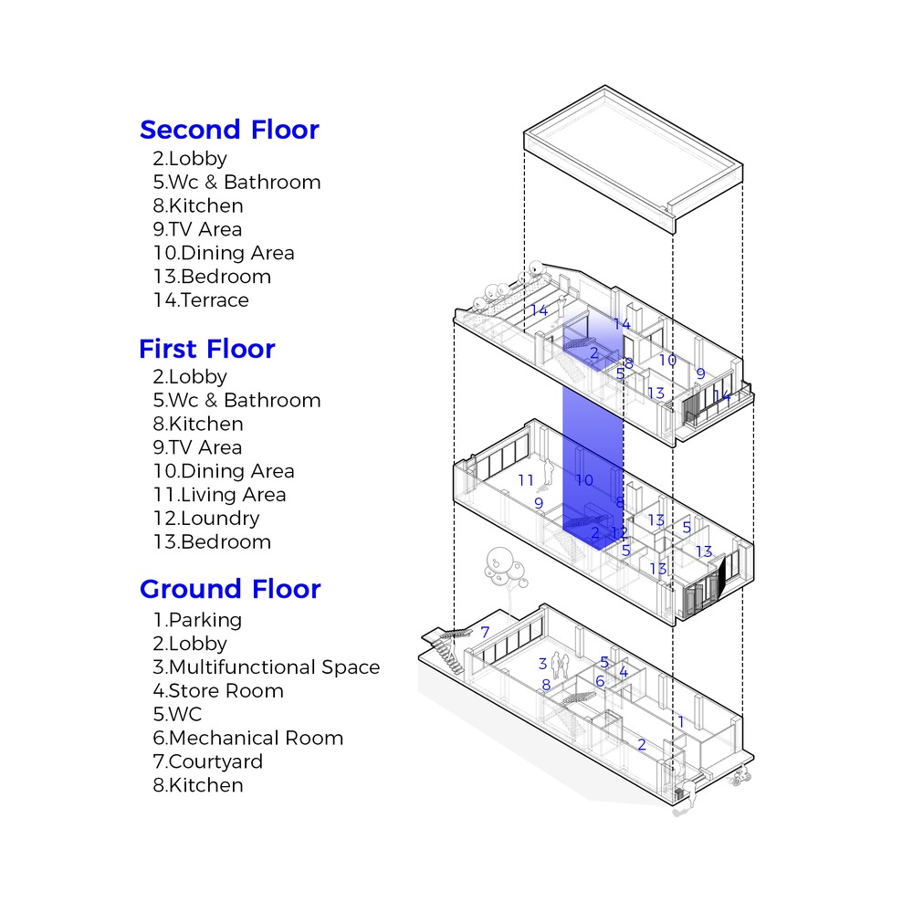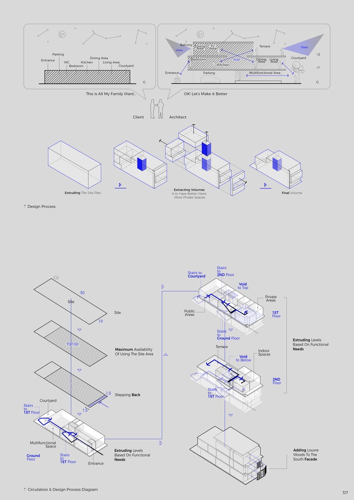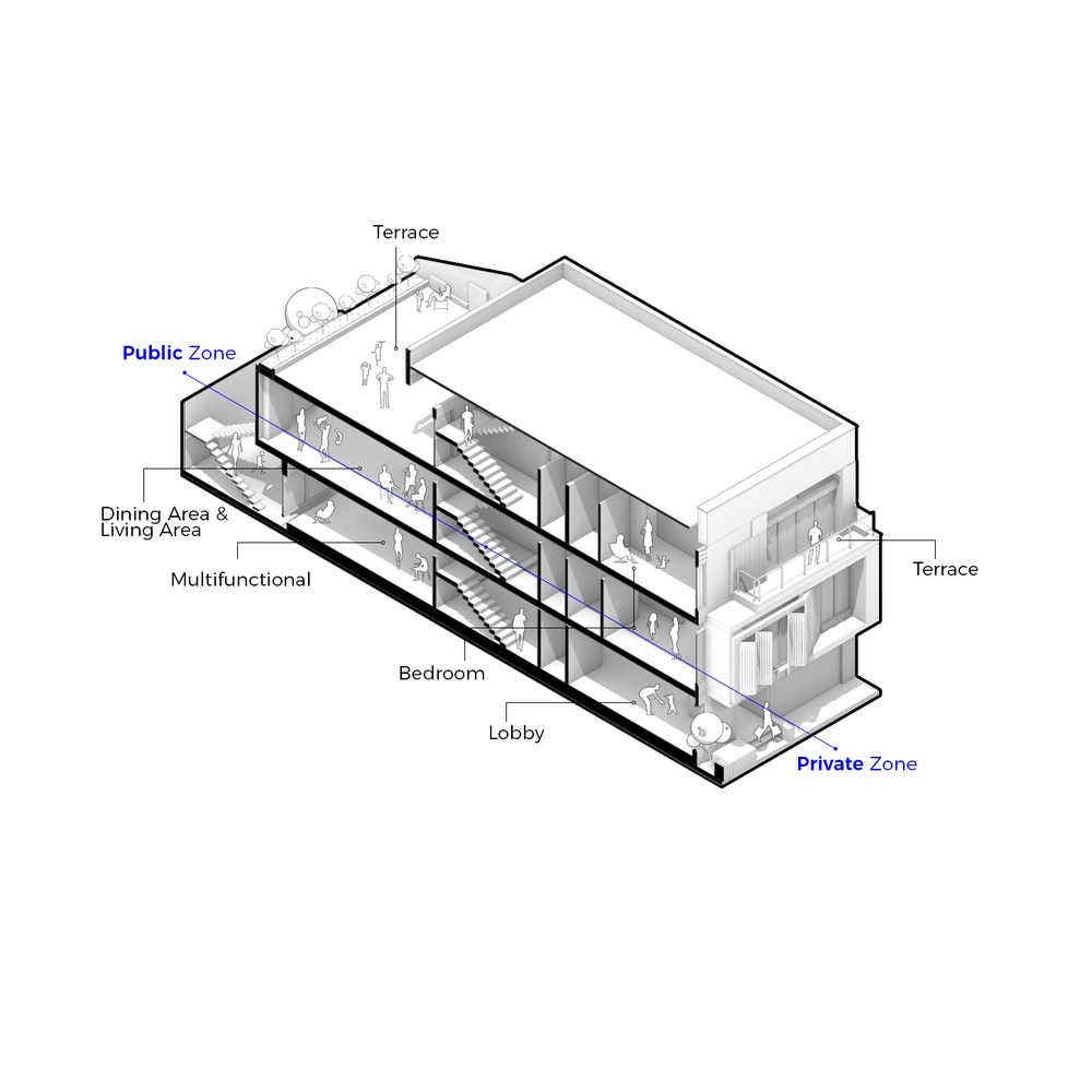 چالش طراحی این خانه بازتعریف فضای مسکونی با در نظر گرفتن عملکردهای جاری در زندگی روزمره این خانواده و در جهت خلق معماری سطوح با ترکیبی از فضاهای باز و نیمه باز در هر سطح شد. سازماندهی فضایی کلی با سطح اشغال ۷۰ درصد و با در نظر گرفتن ۱٫۵ متر عقب نشینی در همکف و اختصاص این تراز به فضاهای عمومی چون پارکینگ، انباری، تاسیسات، لابی و یک فضای چند عملکردی که در ارتباط با حیاط جنوبی است، شکل می پذیرد. دسترسی به طبقه اول خانه از دو طریق پلکان سبک در حیاط جنوبی و باکس راه پله و آسانسور در مرکز پلان، امکان پذیر است. با طی پله های لابی وارد خانه می شویم، فضای ورودی یک هشتی است؛ روبروی ورودی آشپزخانه، سمت راست، ورِ نهان خانه و سمت چپ، ورِ پیدای آن قرار گرفته که با حیاط پایین توسط پله ها در ارتباط است. بالای سر ورودی ویدی جا دارد که با نیم طبقهی بالا و حیاط جنوبی طبقه دوم ارتباط دارد و نور طبیعی را به قلب خانه می کشاند.