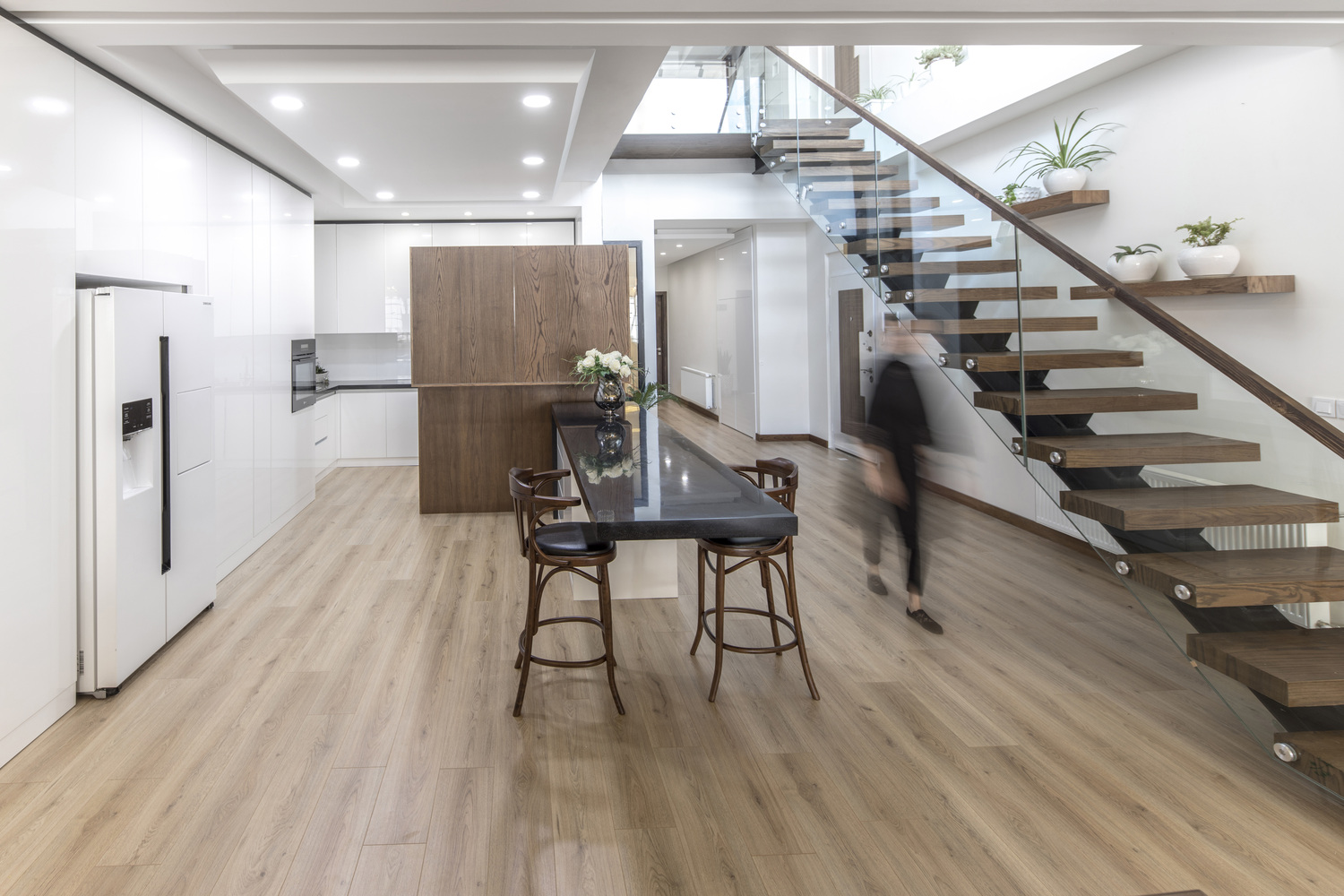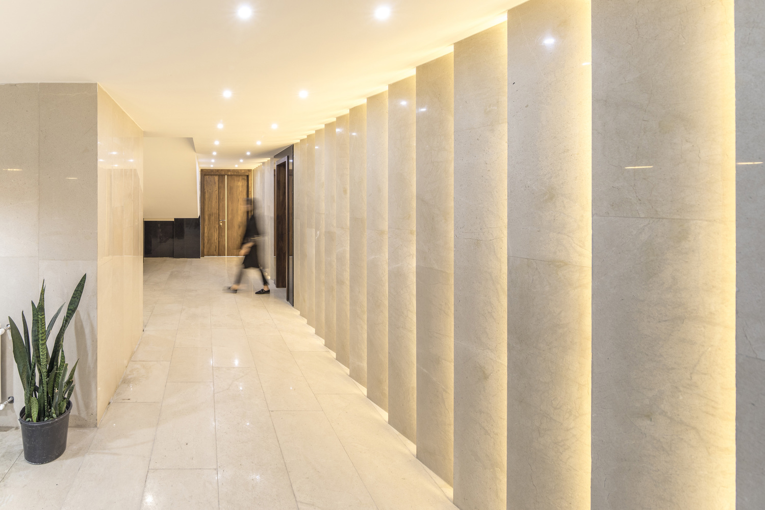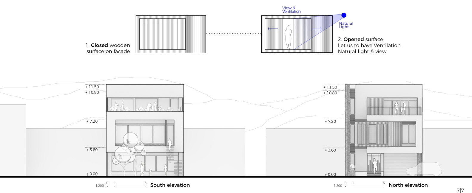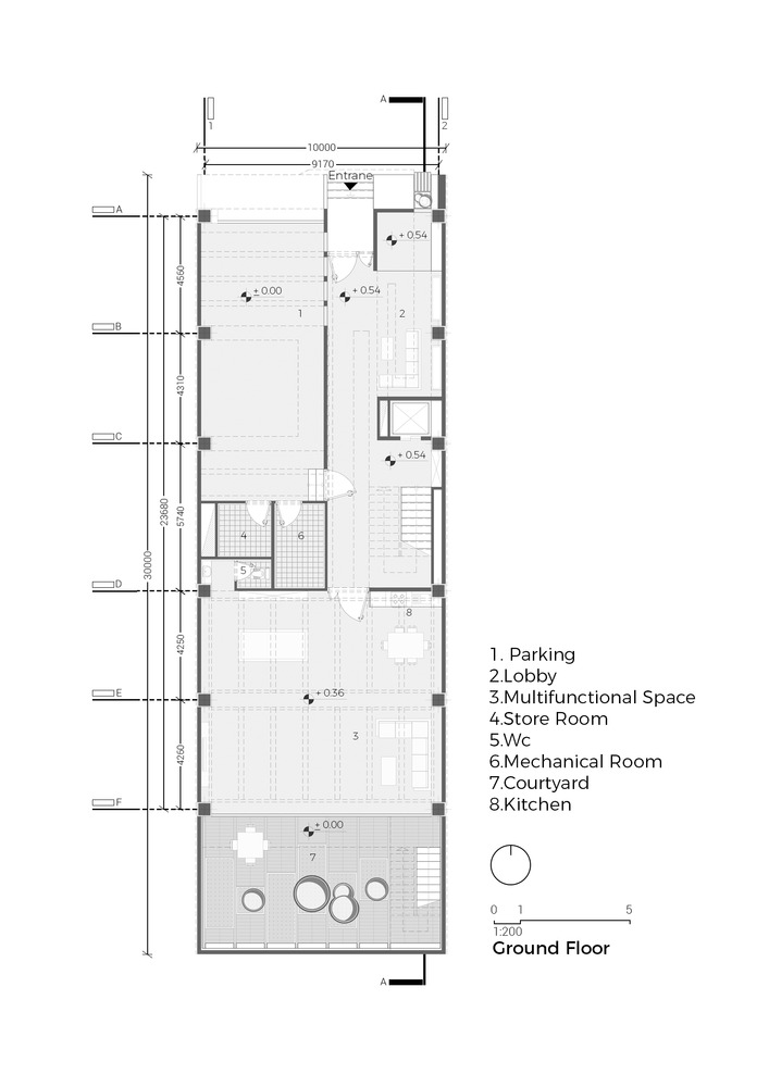 چالش طراحی این خانه بازتعریف فضای مسکونی با در نظر گرفتن عملکردهای جاری در زندگی روزمره این خانواده و در جهت خلق معماری سطوح با ترکیبی از فضاهای باز و نیمه باز در هر سطح شد. سازماندهی فضایی کلی با سطح اشغال ۷۰ درصد و با در نظر گرفتن ۱٫۵ متر عقب نشینی در همکف و اختصاص این تراز به فضاهای عمومی چون پارکینگ، انباری، تاسیسات، لابی و یک فضای چند عملکردی که در ارتباط با حیاط جنوبی است، شکل می پذیرد. دسترسی به طبقه اول خانه از دو طریق پلکان سبک در حیاط جنوبی و باکس راه پله و آسانسور در مرکز پلان، امکان پذیر است. با طی پله های لابی وارد خانه می شویم، فضای ورودی یک هشتی است؛ روبروی ورودی آشپزخانه، سمت راست، ورِ نهان خانه و سمت چپ، ورِ پیدای آن قرار گرفته که با حیاط پایین توسط پله ها در ارتباط است. بالای سر ورودی ویدی جا دارد که با نیم طبقهی بالا و حیاط جنوبی طبقه دوم ارتباط دارد و نور طبیعی را به قلب خانه می کشاند.