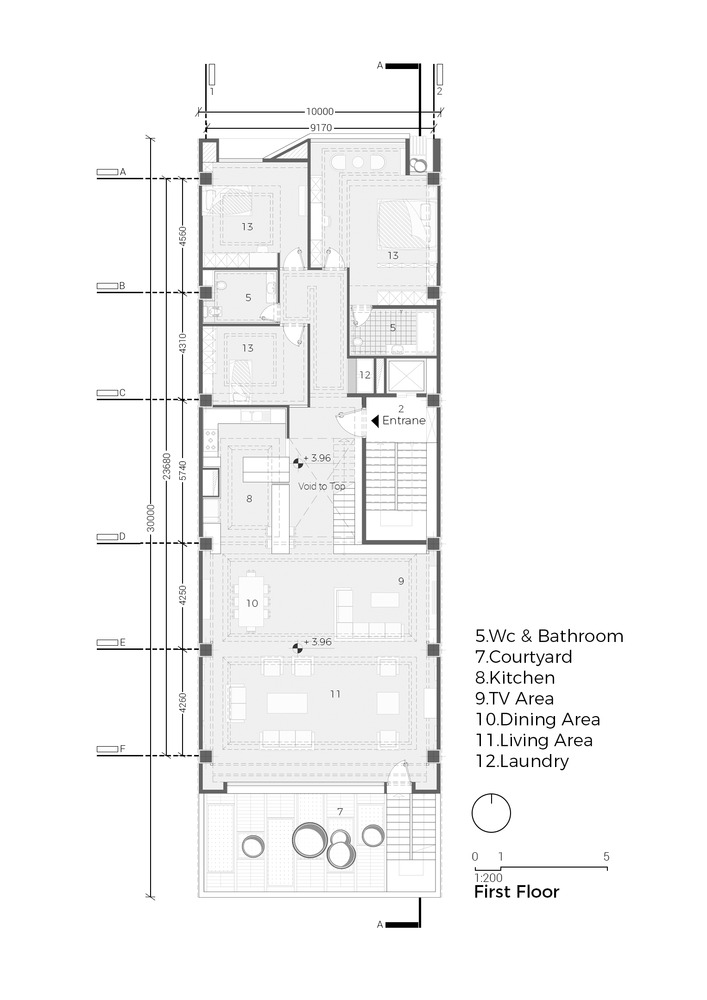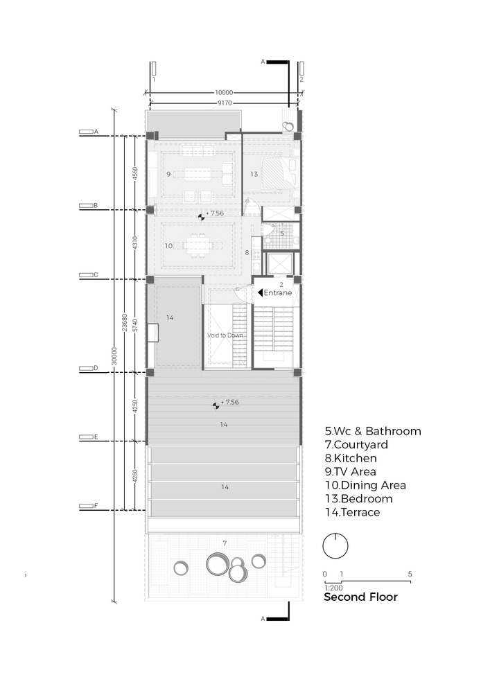 طبقه ی دوم با دارا بودن نیمی از سطح اشغال، بیشتر به فضای باز و نیمه باز اختصاص یافته است و فضای ساخته شده به عنوان مکمل حیاط عمل می کند.