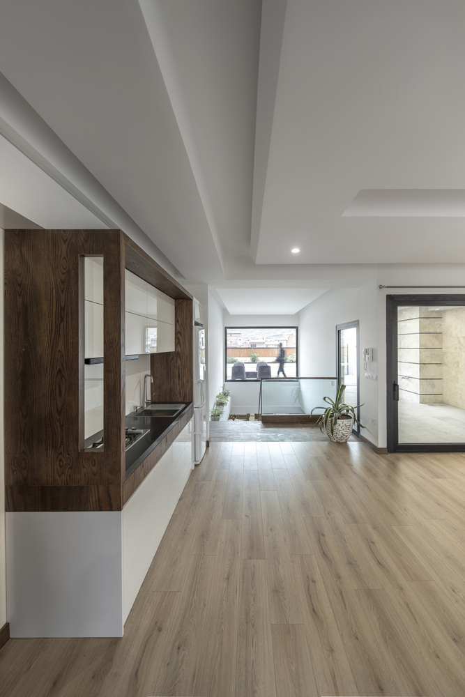 خانه شامل سه اتاق خواب می باشد؛ در اتاق والدین امکان کنترل نور، دید و همچنین میزان دیده شدن با تعبیه ی کرکره ی چوبی وجود دارد. اتاق پرنیان (فرزند دختر) با کمی عقب نشینی از سطح خیابان خود را از دید مصون می دارد و اتاق کودک با نفوذ نور جنوب از فضای وید روشن می شود. ورِ پیدای خانه فضای نشیمن و سالن پذیرایی است که با بازشوی کشیده به ابعاد عرض زمین از نور جنوب تا حد ممکن بهره می برد و توسط پلکان سبک به طبقه ی دوم متصل می گردد.